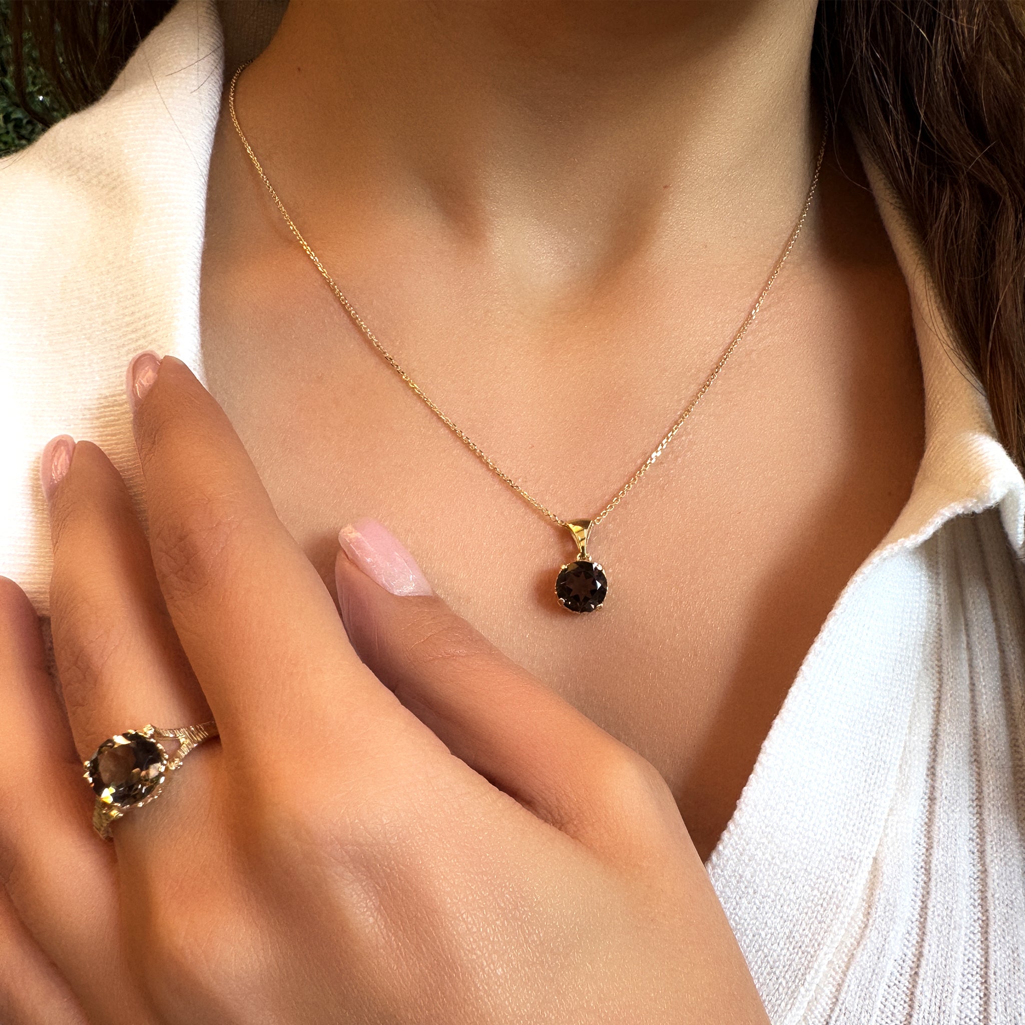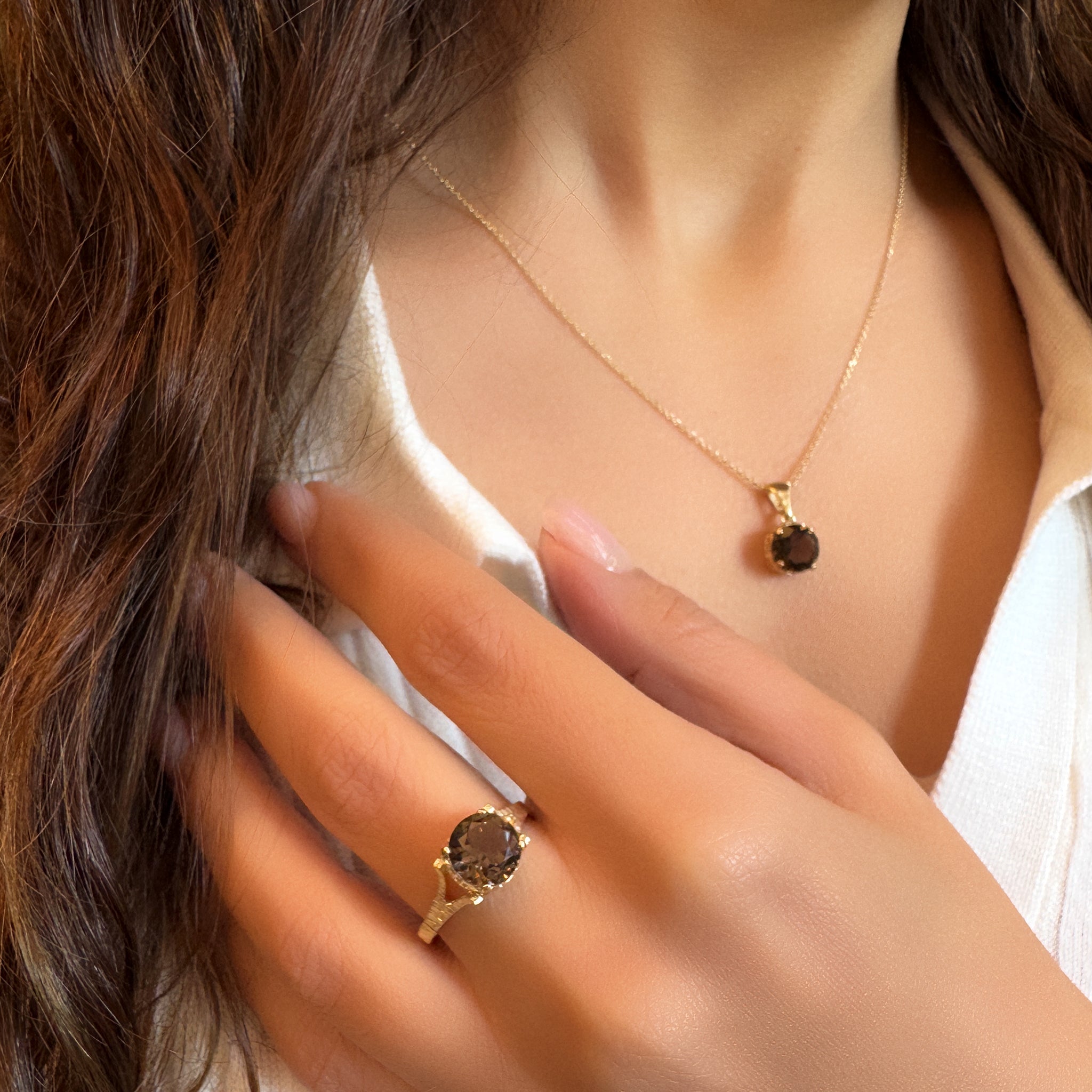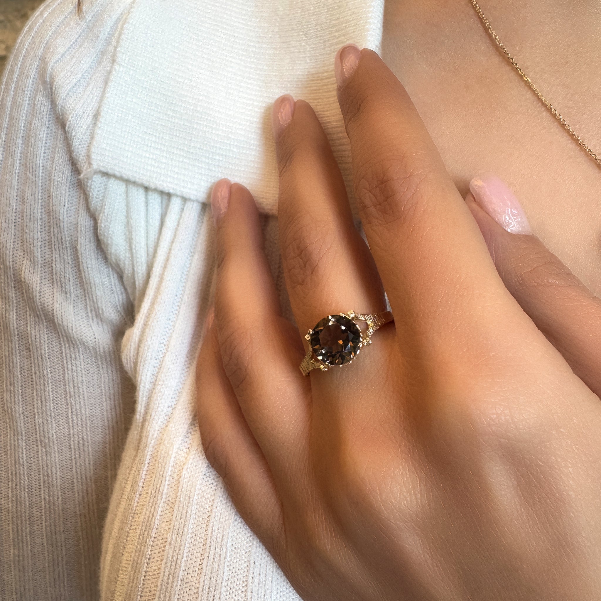 14K yellow gold ring inlaid with 8 mm smoky stones.