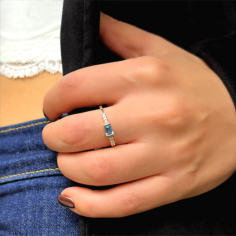 14K yellow gold ring set with a blue topaz octagon gemstone 3/5 mm in the center, decorated with 3 diamonds on each side.