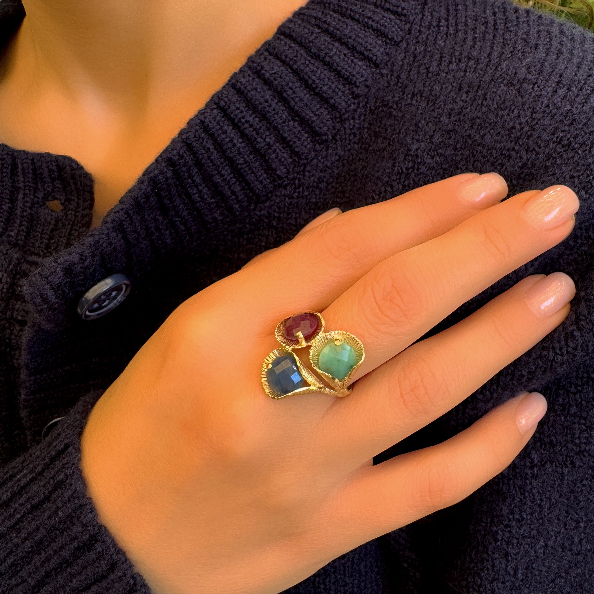 14K yellow gold shell ring set with 8 mm natural emerald, sapphire, and ruby stone, exquisite vintage design with hand engraving inspired by the natural world.