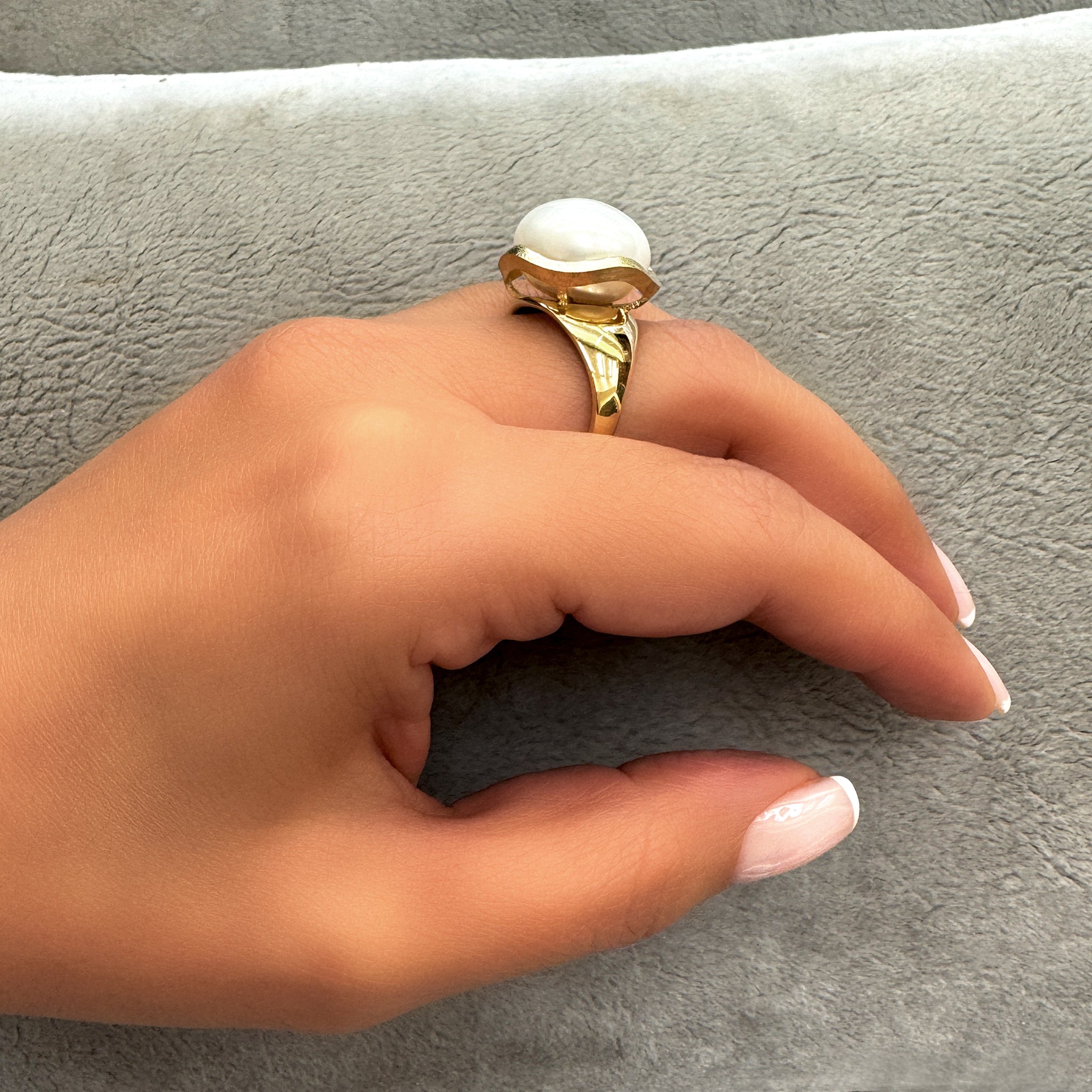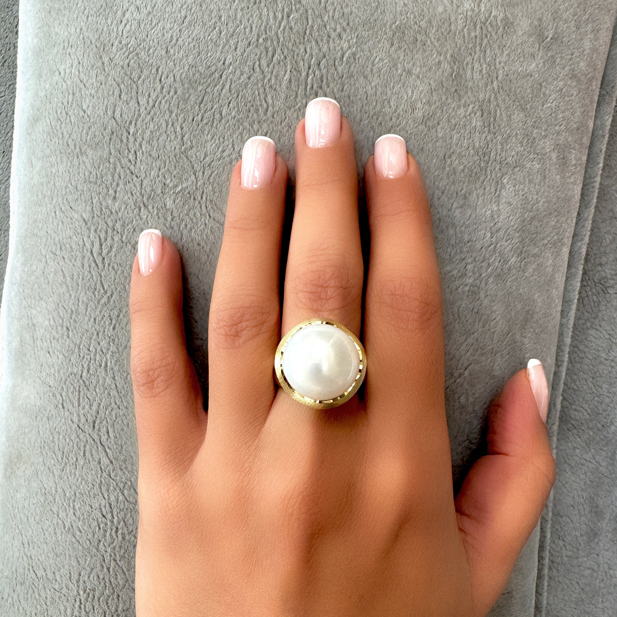 14K yellow gold ring, set with a 14 mm white pearl - the ring oscillates in a circularity that gives a sense of harmonious movement like the moon.