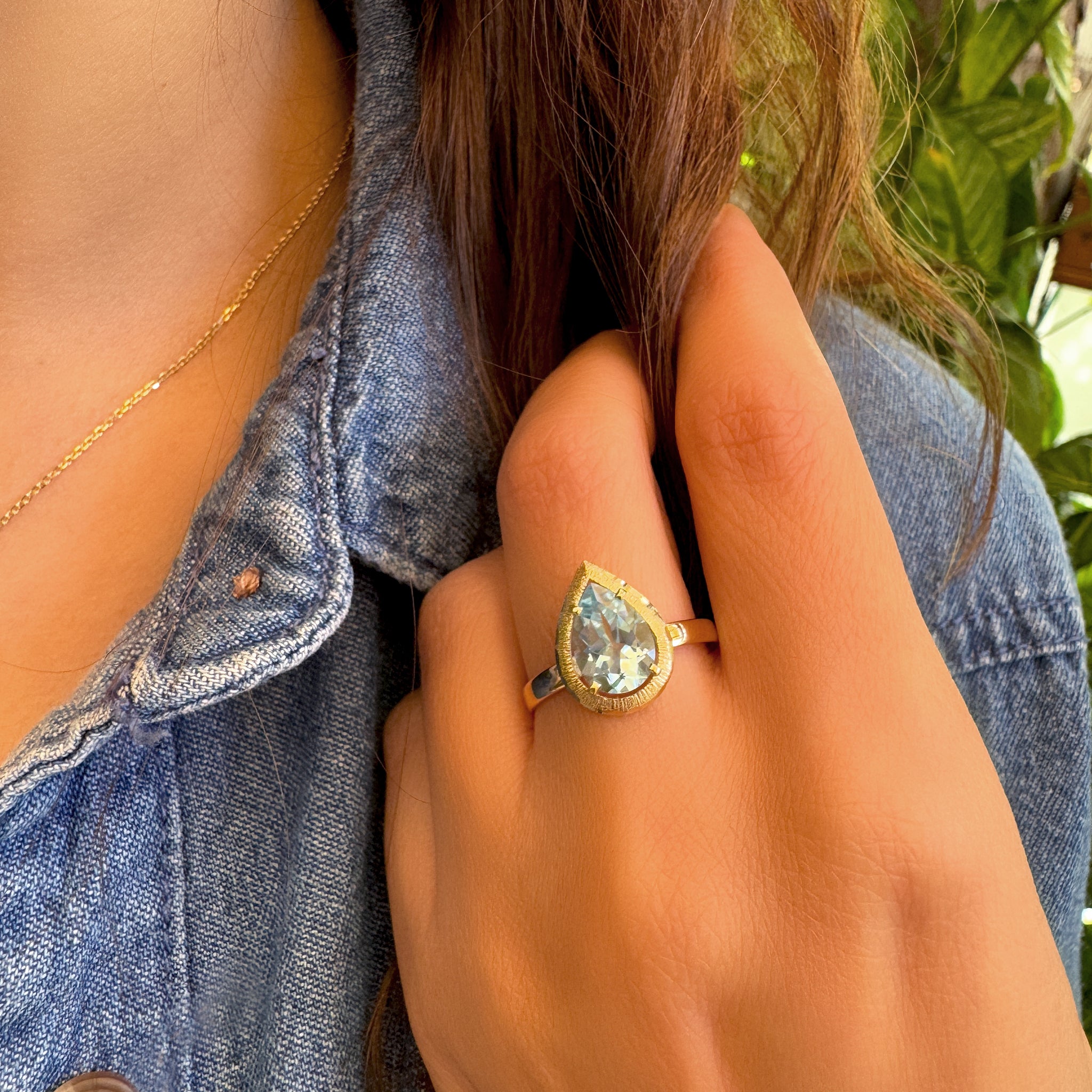 14K yellow gold ring with a drop-shaped gemstone, 7/10 mm blue topaz, in a refined design that creates a timeless and elegant piece of jewelry.
